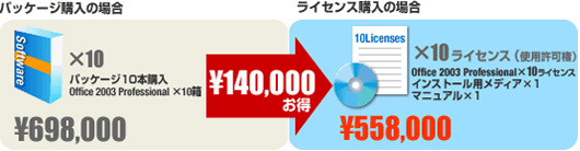 会社などで、まとまった数のソフトウェアを一括購入するなら、ライセンス(マスターCD-ROMと必要な数の「使用許諾」(ライセンス証書)を取得すること)がお得です。